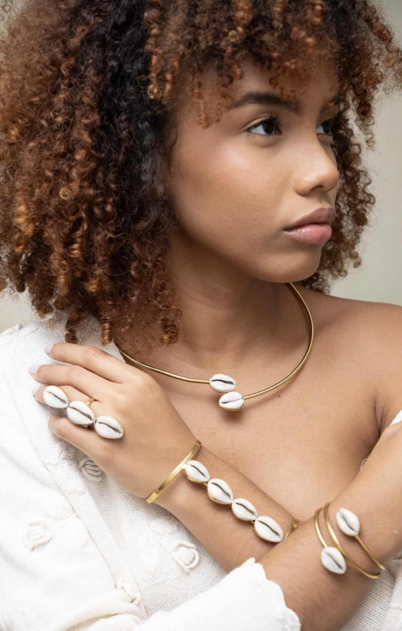 Este hermoso conjunto de inspiración africana está compuesto de collar, pulsera y anillo. Está elaborado con una combinación de elementos naturales. Son piezas llamativas echas con cuentas de hueso africana tradicionales de latón y conchas cauri. Son únicos y con un diseño detallado. Están elaboradas a mano.