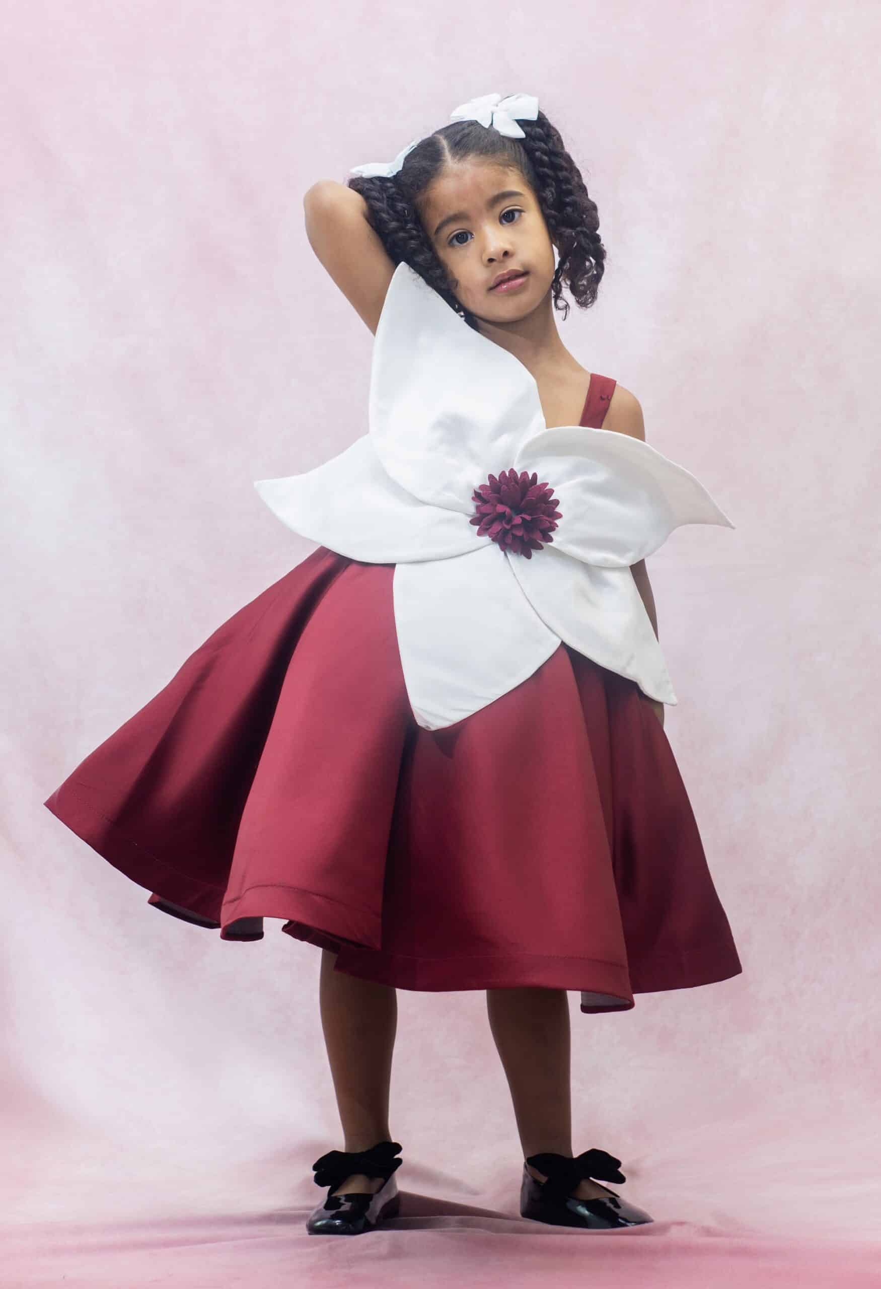 El vestido de petalo combina el encanto del satén granate con la pureza de una gran flor blanca tridimensional.