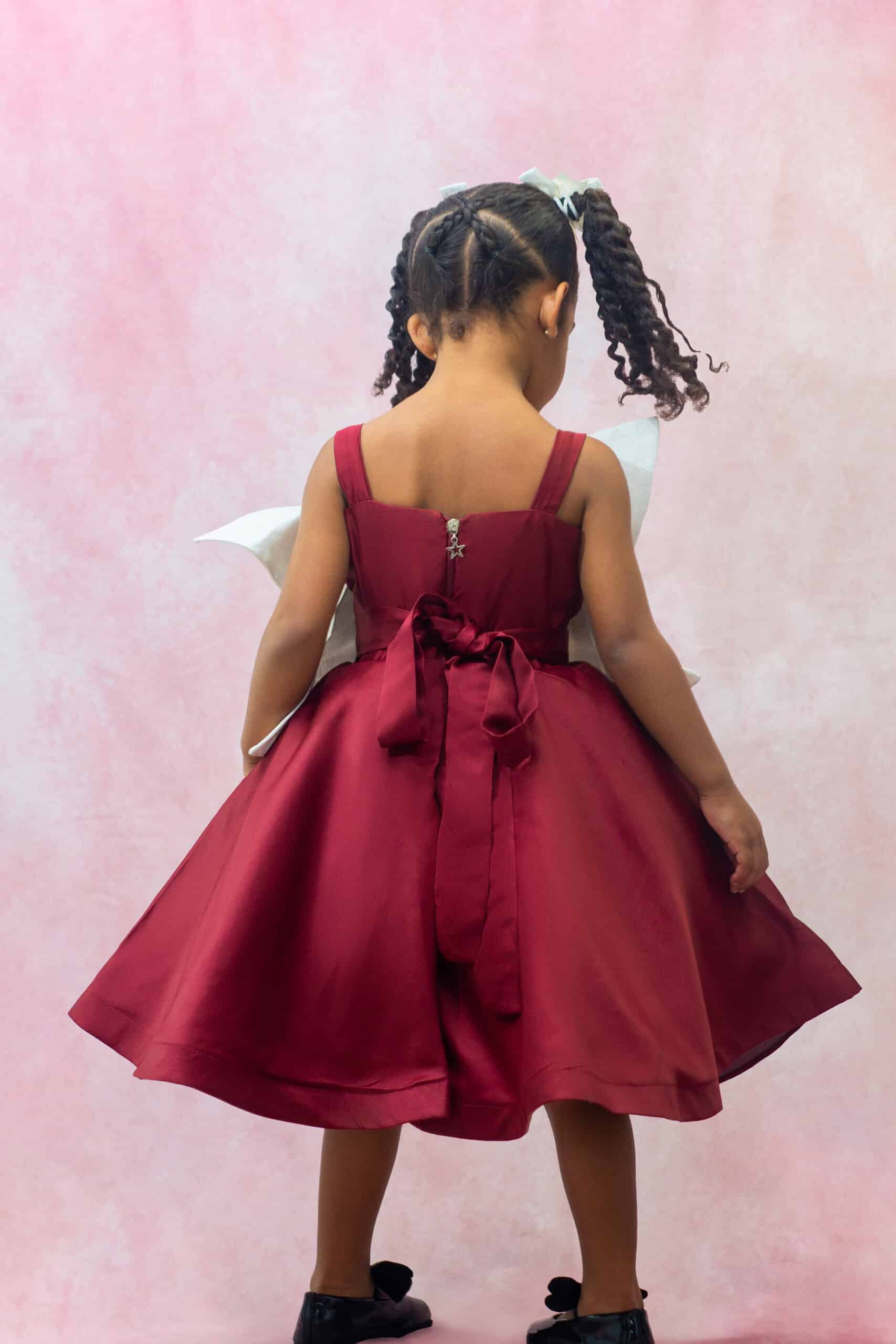 El vestido de pétalos está confeccionado en un suave satén de tono granate profundo ,deslumbra por su grande flor blanca que adorna el frente del vestido. Es ideal para fiestas o cualquier evento.