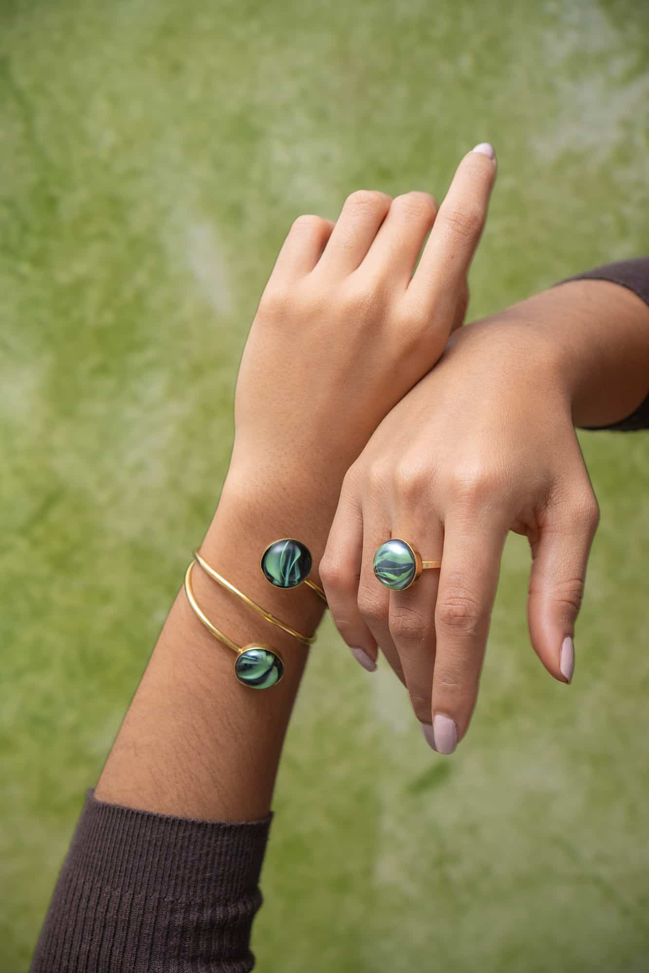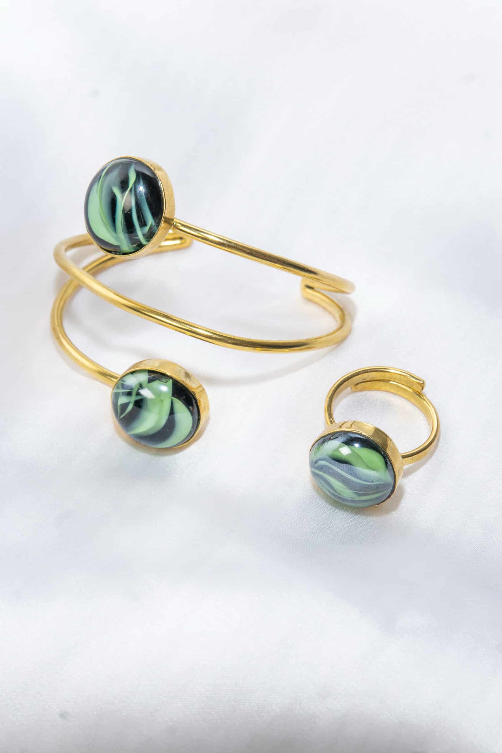 Conjunto esmeralda de pulsera y anillo dorados con una perla verde vibrante que aporta elegancia y da un toque de distinción a cualquier look.