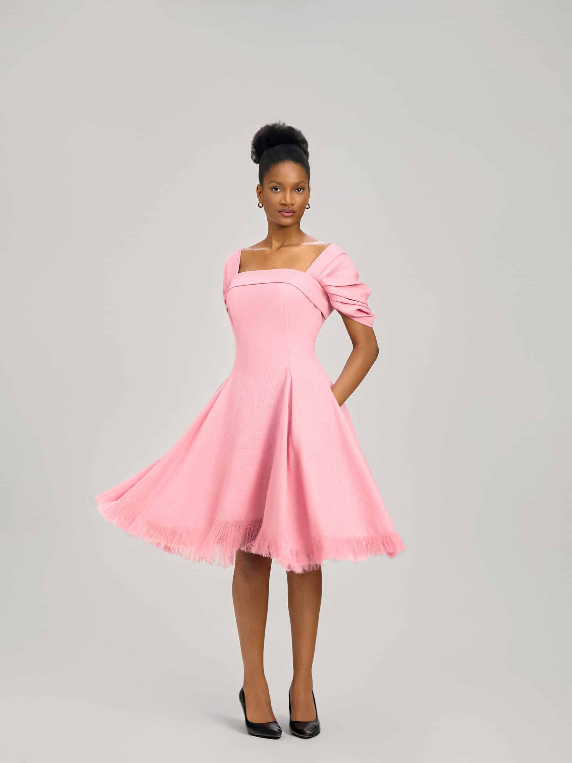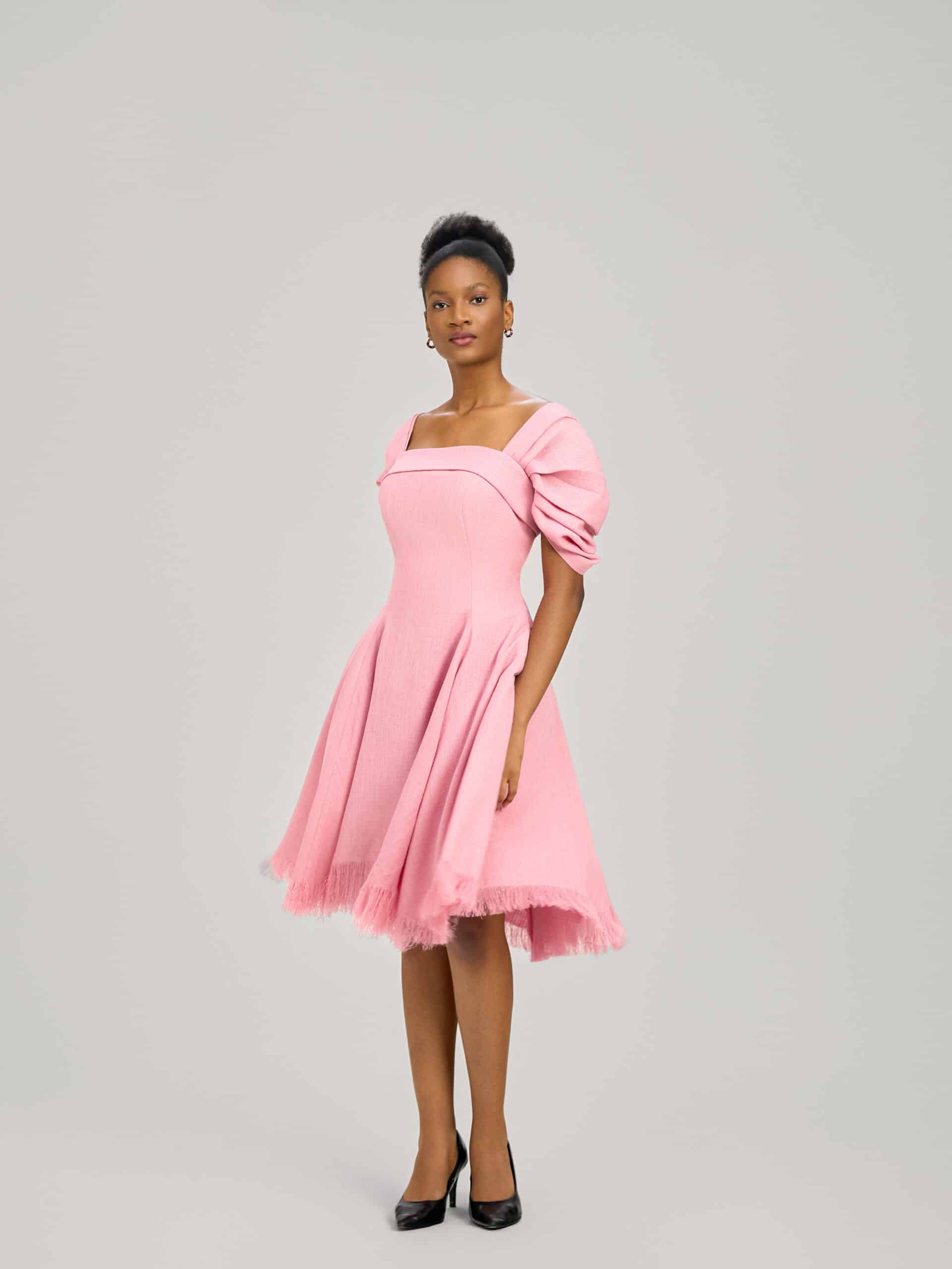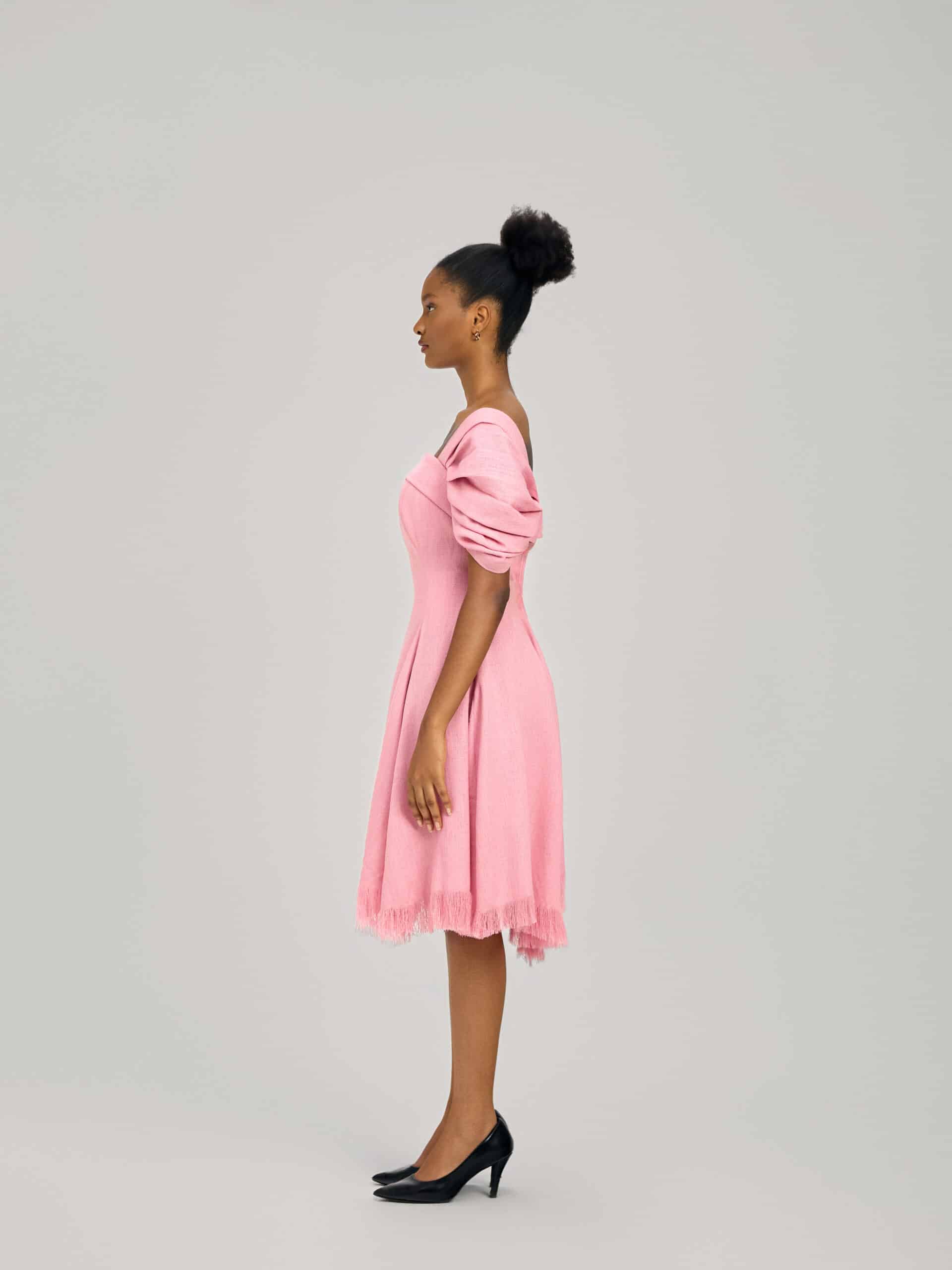Vestido de tela de seda tela y de algodón tejida. Presenta un dulce color rosita. De diseño tradicional y elegante.