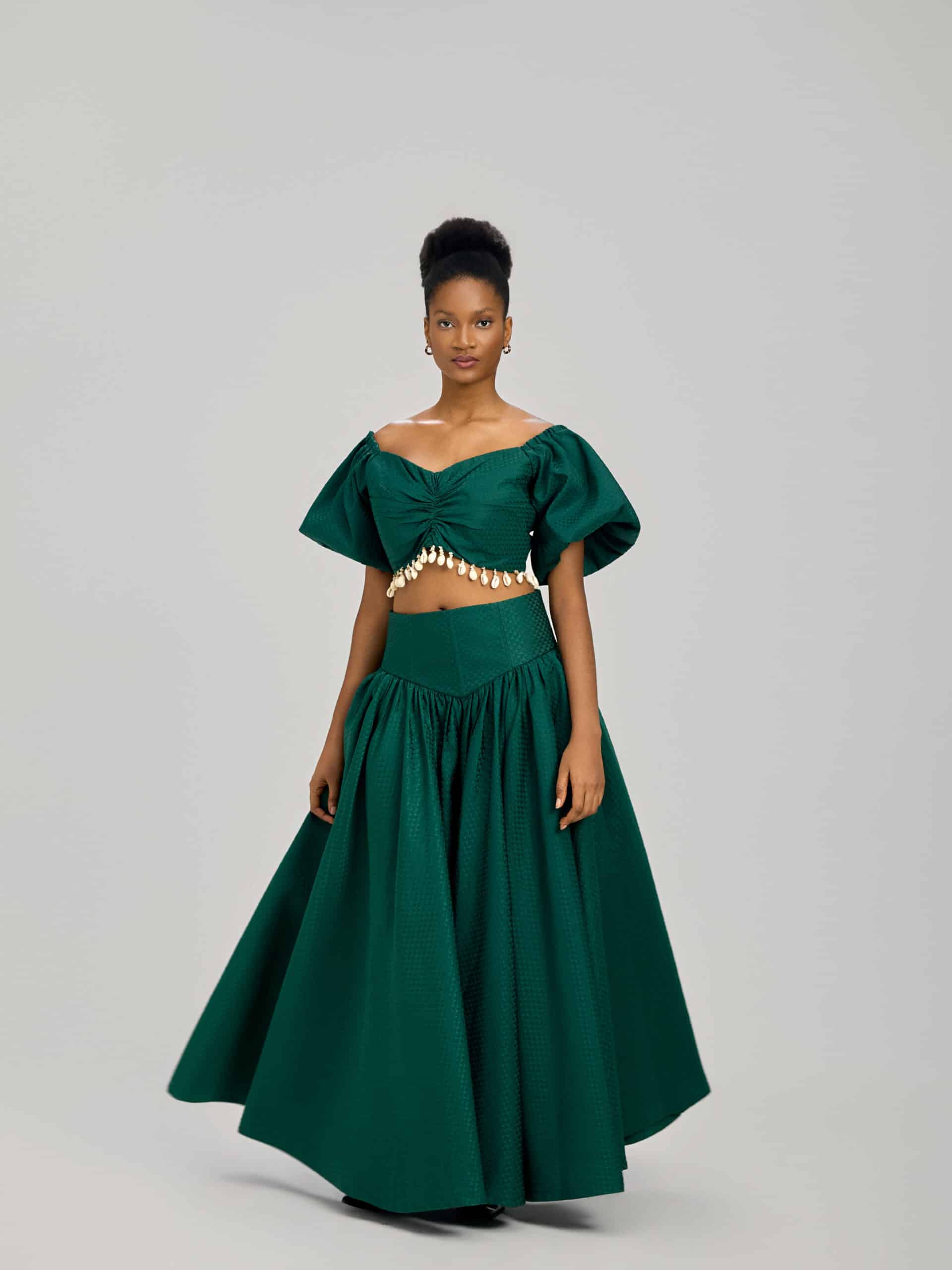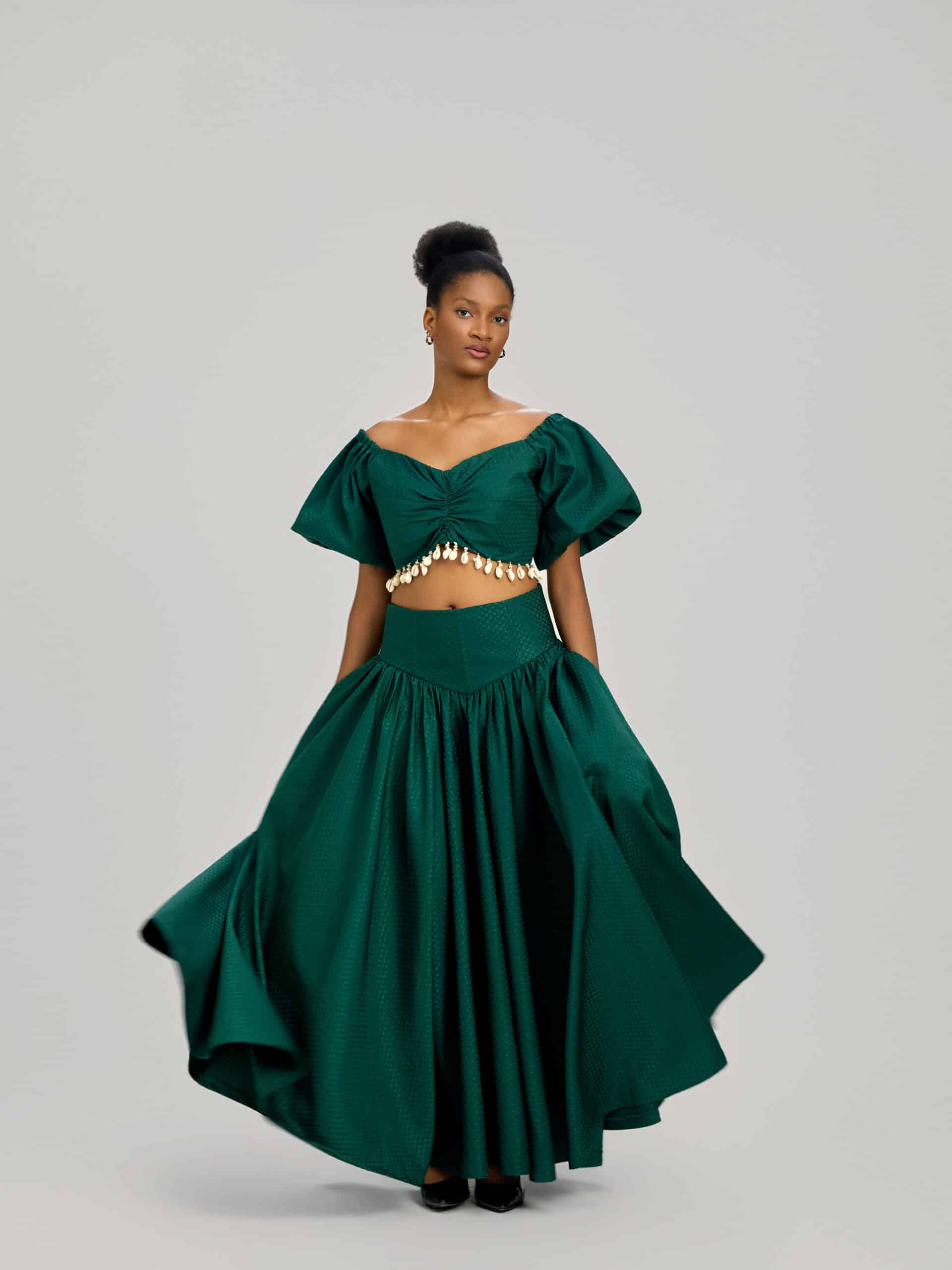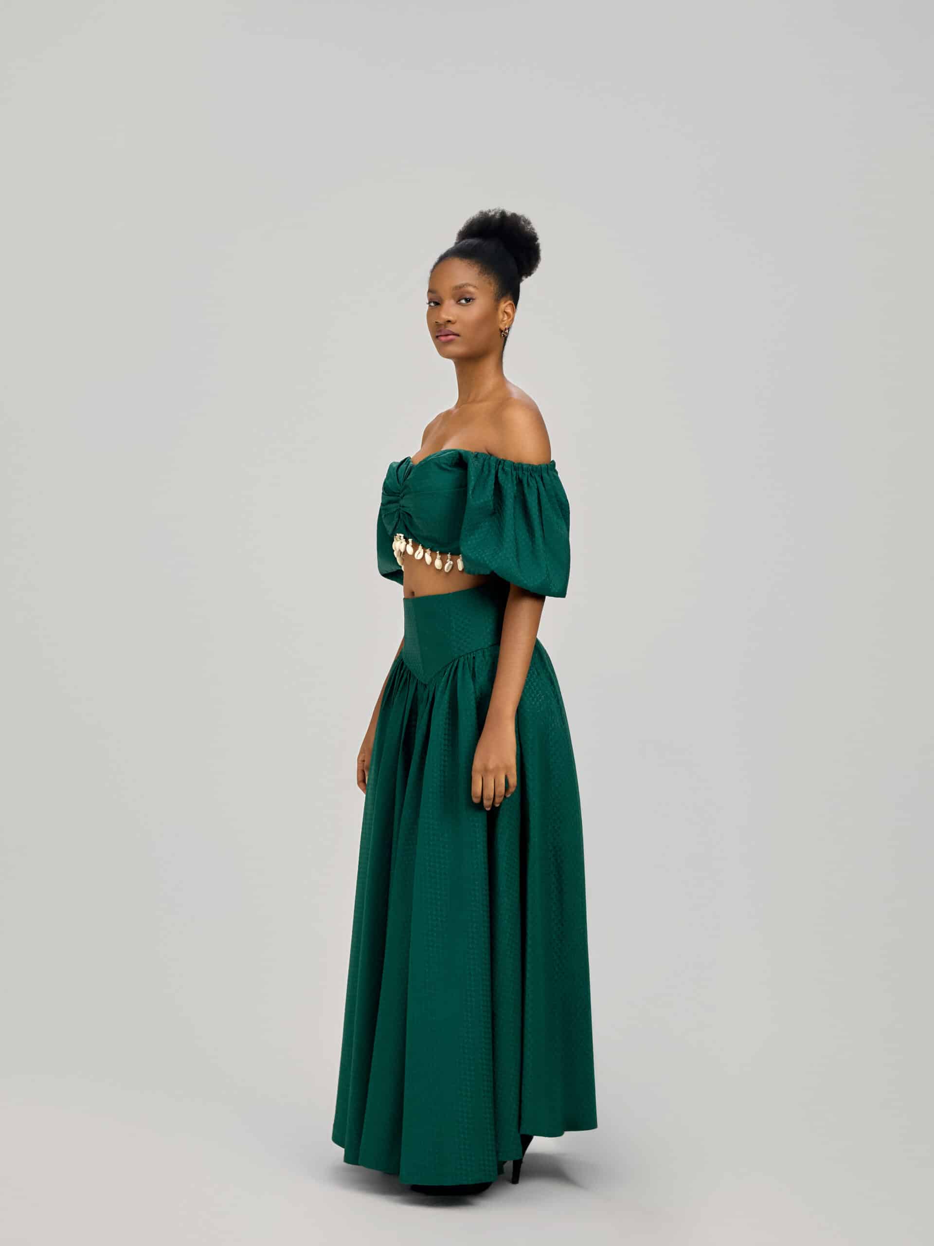 Set de dos piezas con una blusa de hombros caídos acabado con unos beans. Elegante para primavera,verano y otoño. Compuesto con una falda larga de satén y de cintura alta. Hecha a medida.