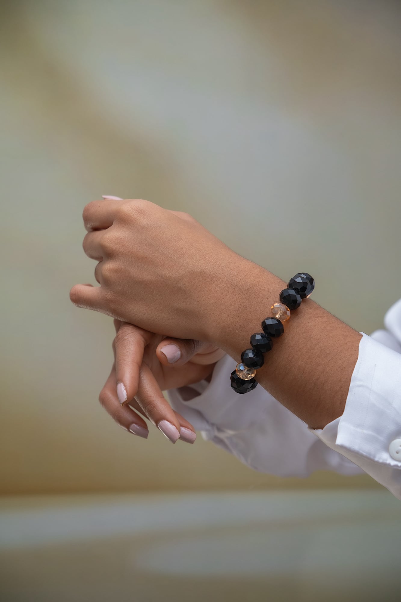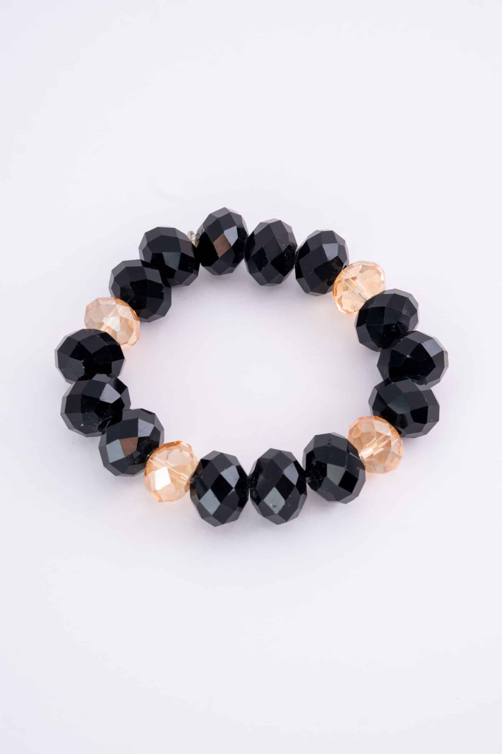 Pulsera elástica artesanal con una impactante combinación de cuentas facetadas en negro brillante y un toque de cuentas ámbar translúcidas que añaden un contraste sofisticado y moderno.
